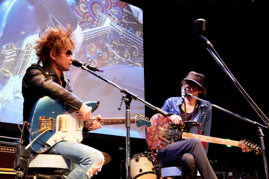ここで、お互いのギターについての話題へと進む。Kenの使用ギターはマスタービルダーのグレッグ・フェスラーが製作したペイズリー模様のStratocasterで、独特のカラーリングが特徴。Kenは「以前にGalaxy Redのストラトを作ってもらって、そのあとTelecasterが欲しくなったんです。テレキャスを作る時にこういう柄で、という話をしていたんですけど、一抹の不安を覚えたんですね。俺はストラトしか使わないんじゃないかなって(笑)。それで、ストラトもお願いしてできたのがこれです。マスタビルダーのグレッグ・フェスラーさんにお願いしました。Galaxy Redが良かったから、次もって。そうやってオーダーをしました」と紹介した。