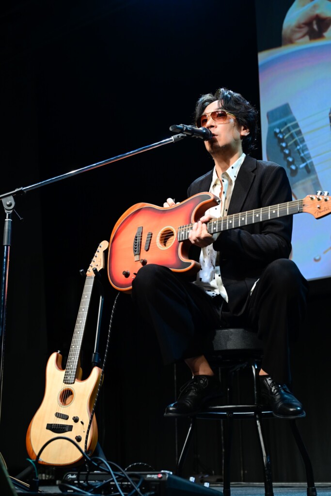 2人揃っての登壇は初めてながら、トークはこんな感じで最初から絶好調。これだけでも楽しい60分になりそうだったが、ここでメインとなるのは、フェンダーが独自に開発し、エレキギターとアコースティックギターを融合させたAcoustasonic、通称アコスタだ。まずは導入として、“2人にとってエレキギターとは?”という問いからスタート。「自分を一番表現しやすい相棒」という春畑に対し、「練習にすごく時間かかるけど、めっちゃ楽しい時もある。めっちゃ腹が立つ時もあるのにやめられない。それがギター」と独特な表現でKenがギター愛を示すと、「楽屋でもずっと弾いてるもんね」と春畑が返す。自然と会話が続いていく感じが心地良い。
