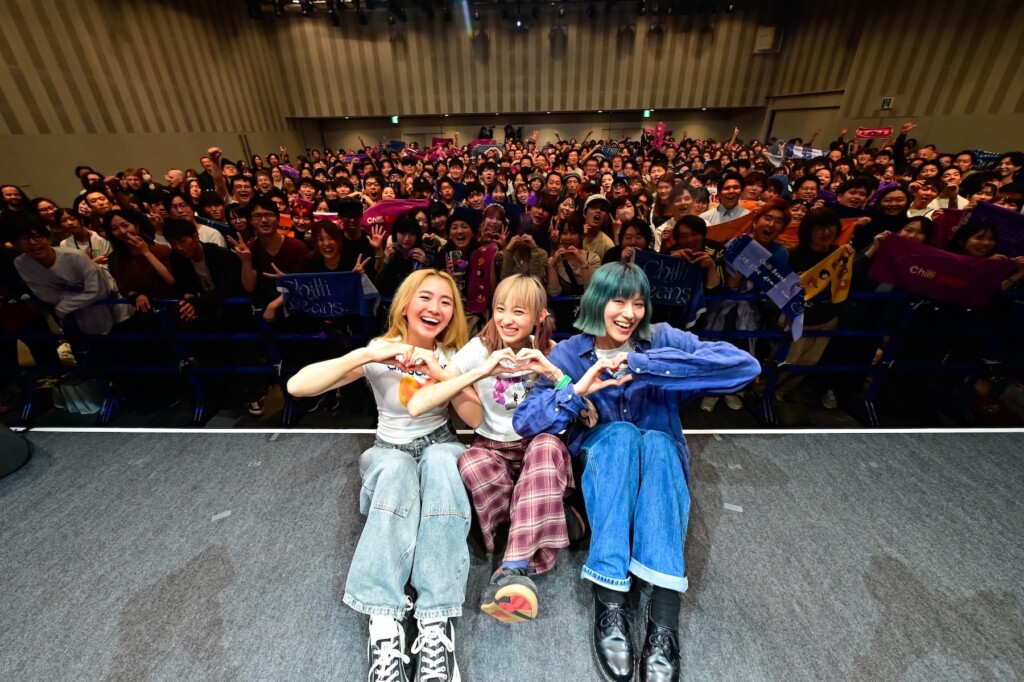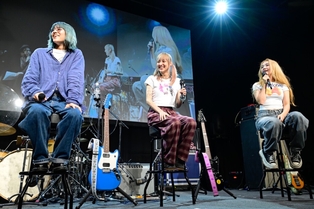 表参道ヒルズ スペースオーの1日目のトリを飾ったのは、2024年2月に日本武道館公演を成功させ、勢いに乗るチリビことChilli Beans.のライヴ&トークセッション。観客の大歓声に迎えられた3人がこの日、フェンダーから3人それぞれのシグネイチャーモデルを発売したことをMCが改めて観客に知らせると、客席から再び大きな拍手が起こった。MCがシグネイチャーモデルを発売した感想を尋ねると──。