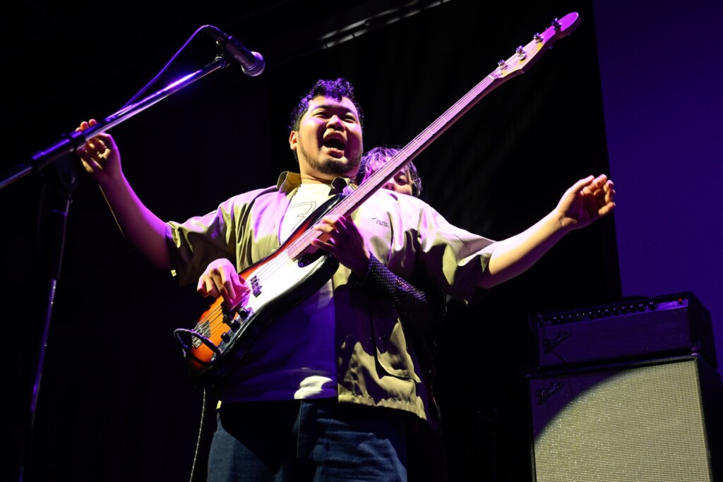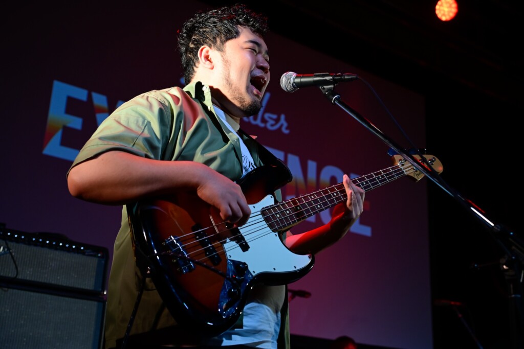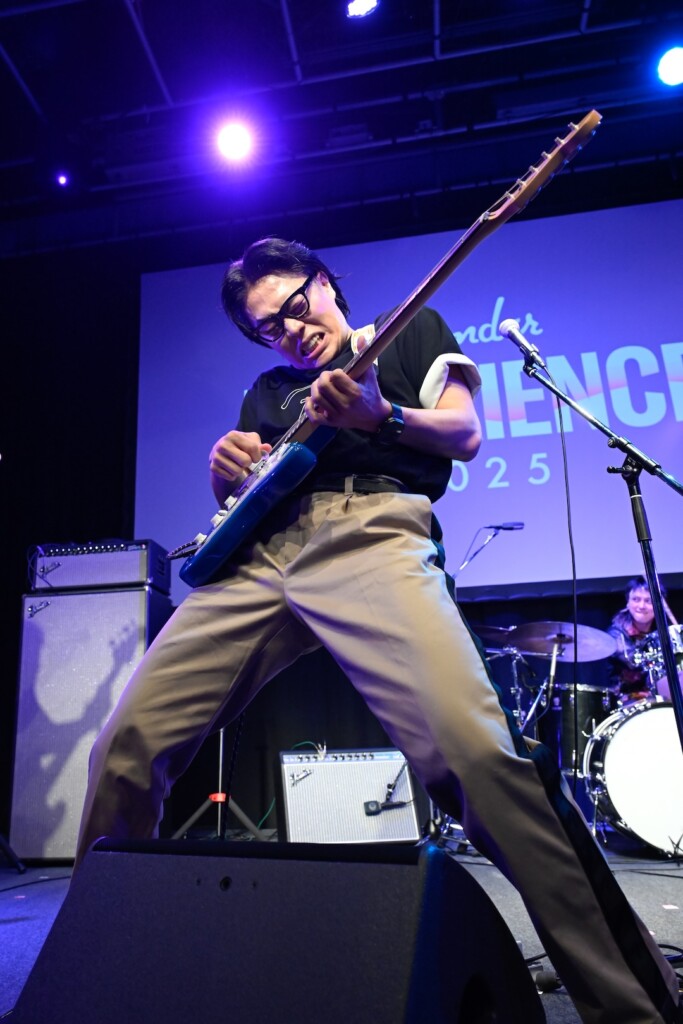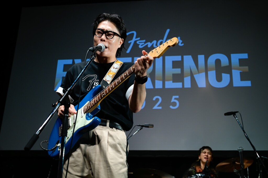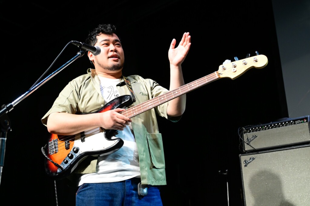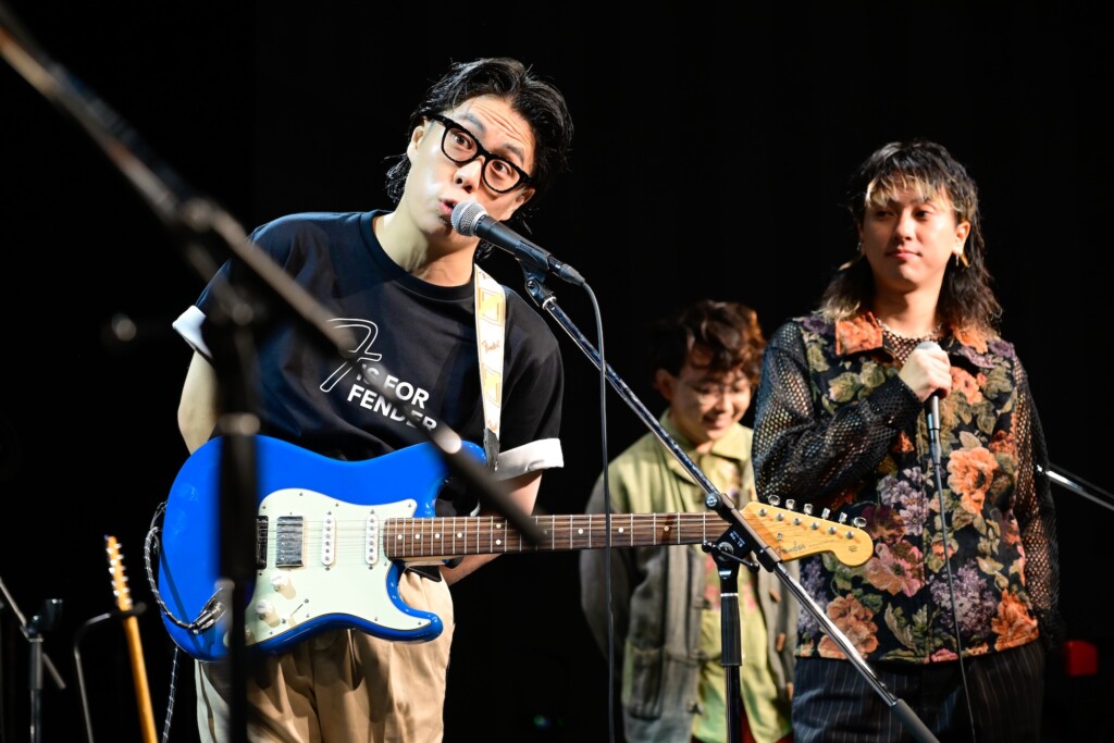 観客がステージを見つめる中、THE BLUE HEARTS「人にやさしく」がスタート。高木が刻むビートに松井の奏でるベースラインが重なって構築されたリズムセクション。くるまといけだのギターが合流し、バンドサウンドが力強く躍動する。少し緊張気味でありながら、鮮やかな青の2024 Collection Made in Japan Hybrid II Stratocaster HSSを奏でながら一生懸命に歌っていたくるま。ケムリはPlayer Jazz Bassを弾きながら、コーラスを加えてハーモニーを響かせる。