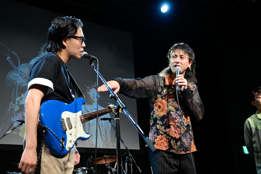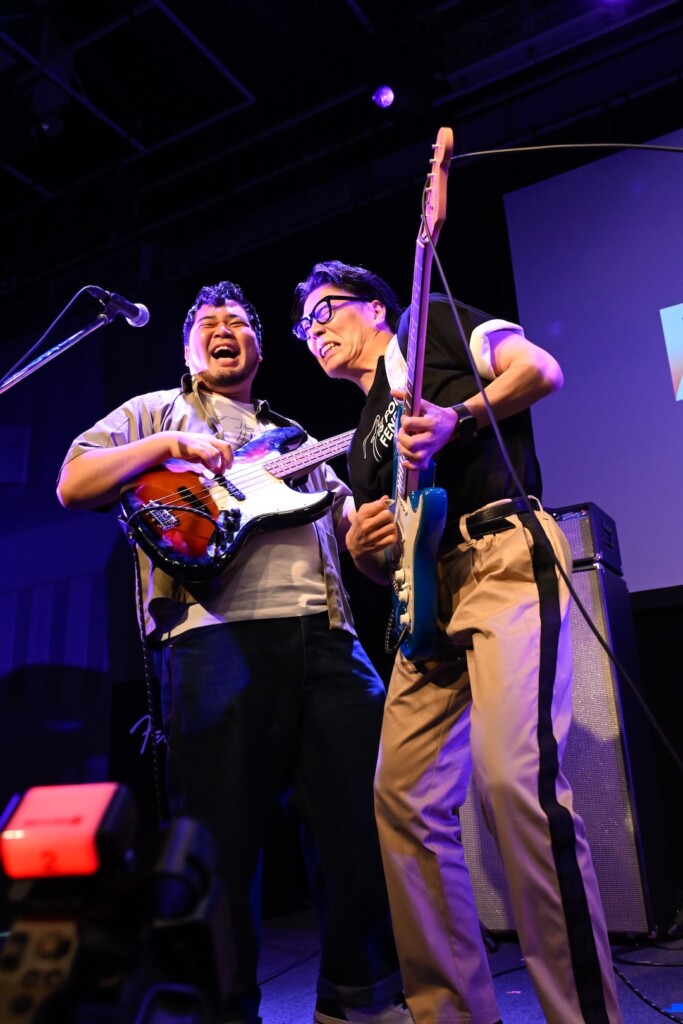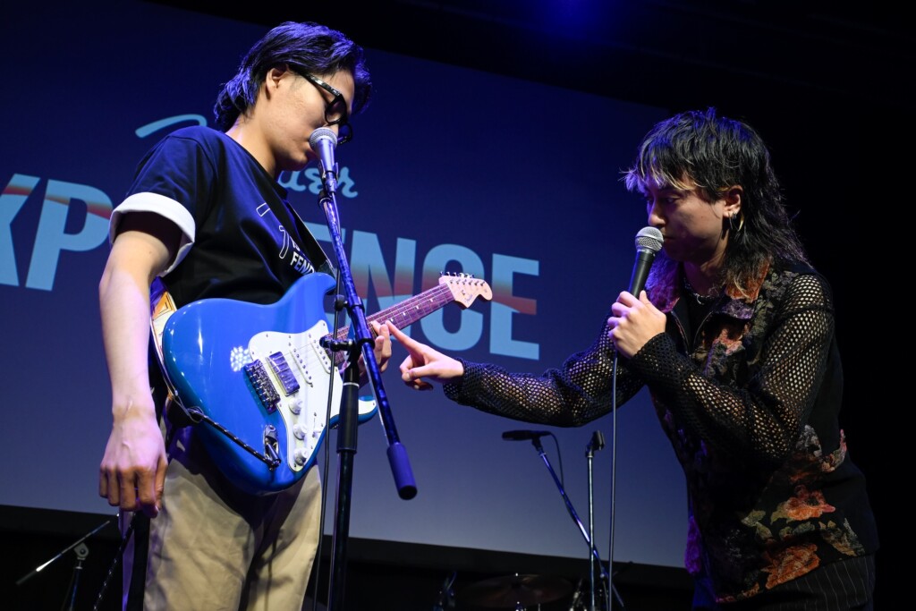 令和ロマンのテンポの良い掛け合いのあと、ラストに披露されたのは小沢健二 featuring スチャダラパー「今夜はブギー・バック」。高木と歌声を交わしたくるまはラップパートも担当。いけだのキーボードソロ、ケムリのベースソロ、観客とのコール&レスポンスを経て、「フェンダーのイベントじゃん? 最後にギターを弾いたほうがいいんじゃない? くるまくんにギターソロをやってもらおうかなと。いかかがでしょう?」と観客に問いかけた高木。「事前に練習しなくてもできるソロがあるから。ハートが大事系のソロ。一番大事なのは顔。音楽を感じてる顔。それでいけるから」というアドバイス受けて、くるまはギターを手にした。そして、高木がドラムを叩き始めて再開されたバンド演奏。ファズのスイッチを踏み、衝動のままにギターを掻き鳴らしながらくるまが放った爆音を浴びて、観客は歓声を上げた。