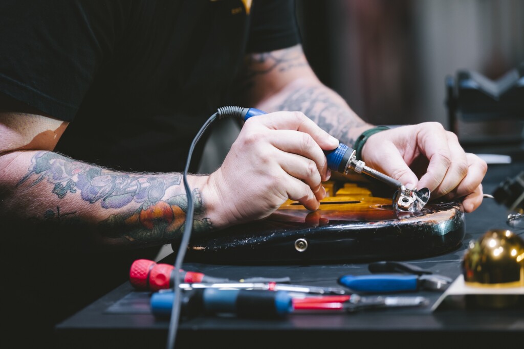 さて、アンディが今回見せてくれたのは、ネックをはじめバラバラになったパーツを1本のギターに組み立てるセットアップのスキルだ。作業はピックガードの裏にある電子回路のはんだ付けからスタート。