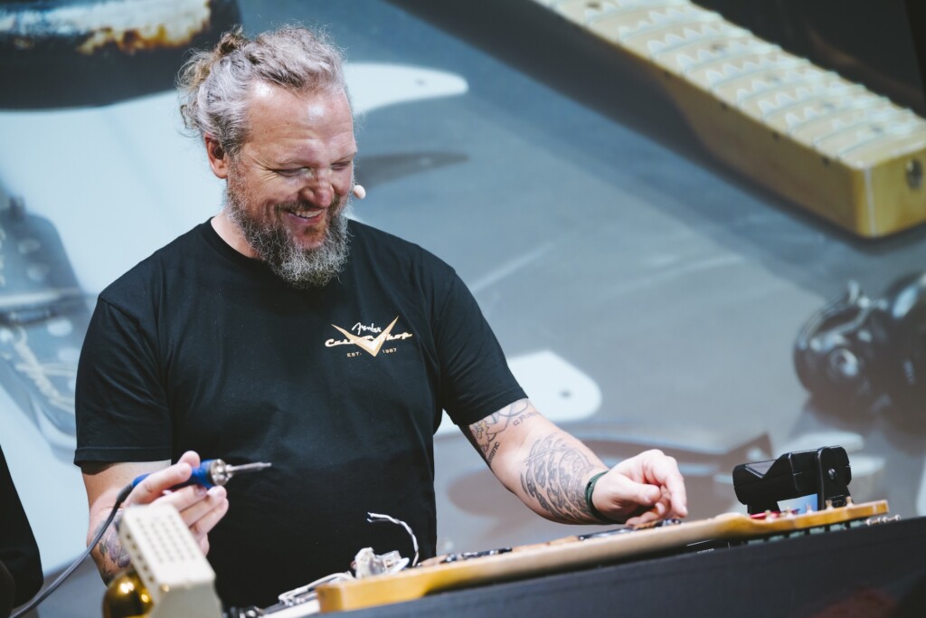 世界最高峰のギター製作技術を誇るFender Custom Shopのマスタービルダーによるワークショップも〈Fender Experience 2025〉の大きな見どころだ。現在12名いるマスタービルダーのうち、今回は4名が来日。1日目のマスタービルダーワークショップにオンステージしたのは、アンディ・ヒックスだ。