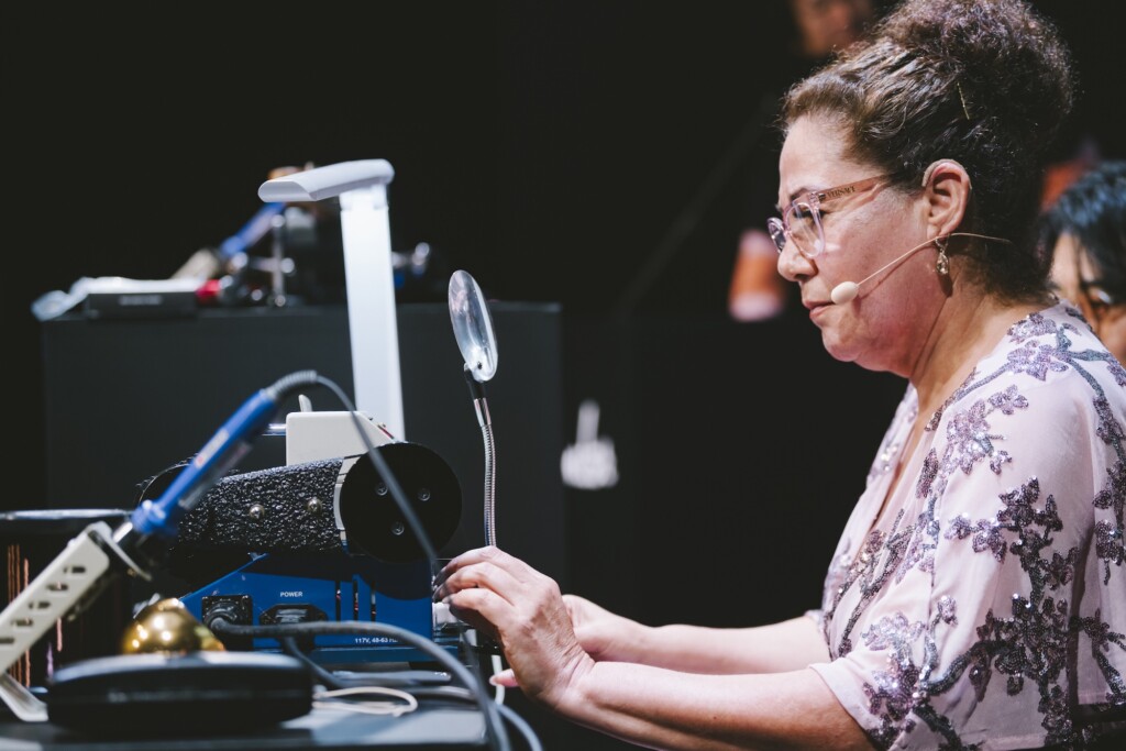 しかし、ワークショップはまだ終わらない。観客がアンディに大きな拍手を送る中、MCに紹介され、伝説的なマスターピックアップワインダー、ホセフィーナ・カンポスがオンステージ。エレキギターの心臓とも言えるピックアップのハンドワインドを実演する。ピックアップボビンをワインディングマシーンで回しながら、そこに極細のワイヤーを83,000回から85,000回巻き付ける絶妙かつ繊細な手の動きがピックアップのクオリティを左右するのだそうだ。