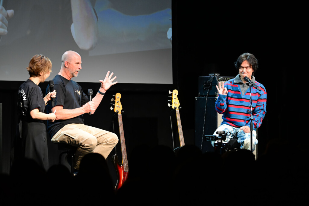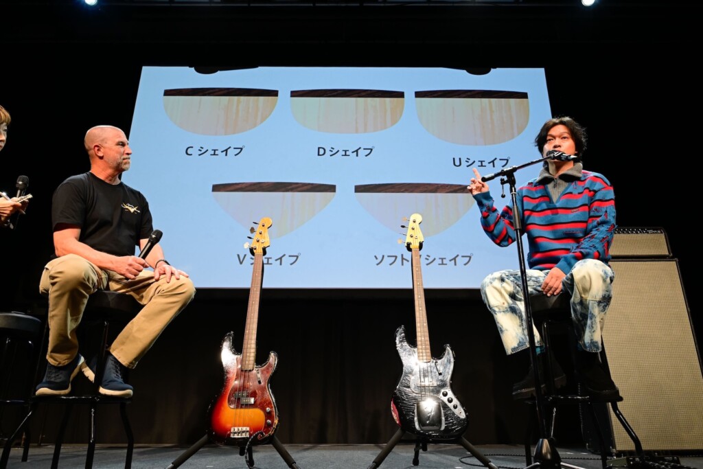 冒頭、登壇したデニスは「今日はここに来られて本当に嬉しい」と満面の笑みを浮かべた。家具職人としてのキャリアを経てフェンダーに入り、ポール・マッカートニーやスティングなどの楽器も手がけてきたビルダーらしい、温かみと職人魂を感じさせる語り口で観客を惹き込む。続いて大きな拍手と歓声に迎えられた丸山隆平は、「そんなにギターやベースの知識があるわけじゃないんですけど、自分の手にぴったりの楽器を作れるという魅力を、少しでも皆さんに伝えられたら」と挨拶した。