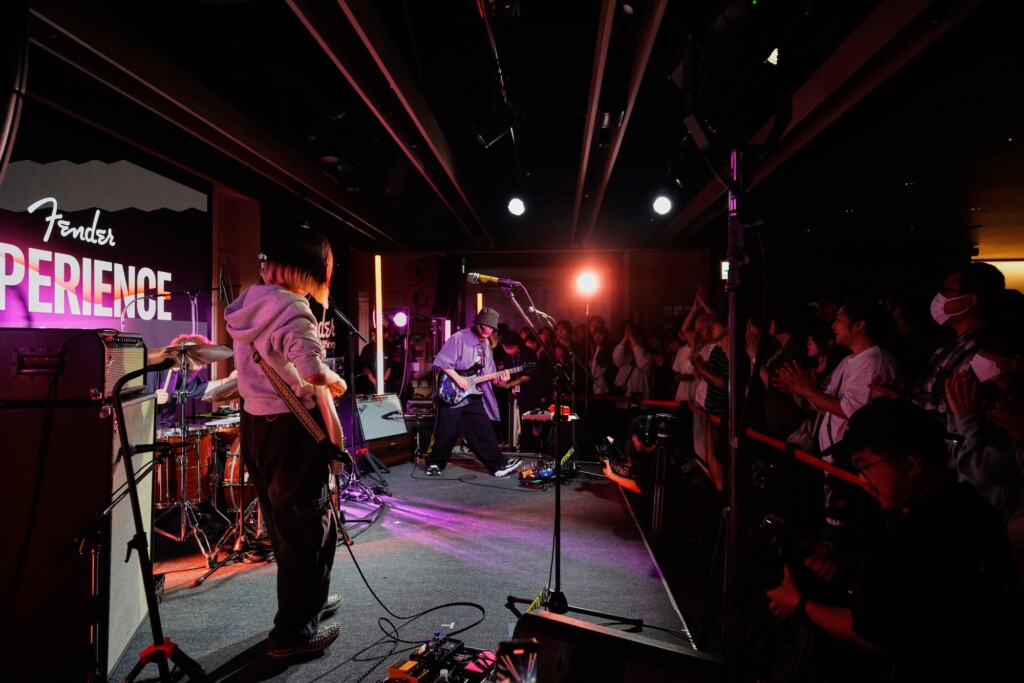 オープニングトークを経てライヴがスタート。最初に届けられたのは「アウトバーン」。夕日がメインヴォーカルを務めつつも、かほ、大樹の歌声も随所で加わるコンビネーションが心地良い。もちろん、フェンダーのギターとベースが大活躍であった。Player II Modified Stratocaster(Sunshine Yellow)でシャープなカッティングをしながら歌い、ソロではミッドとローがバランス良く前に出るクランチサウンドを放った夕日。Player II Modified Active Jazz Bass(Olympic Pearl)によるスラッププレイでダンサブルなビートを生んだかほ。NEEの熱量を間近で触れた観客は、掲げた腕を激しく揺らしながら興奮を露わにする。