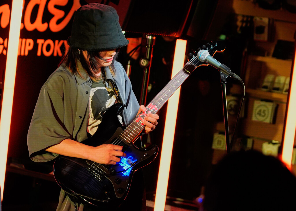 昨年、映画公開から70周年を迎えた特撮怪獣映画シリーズ『ゴジラ』と、同タイミングに70周年を迎えたStratocasterのコラボレーションで製作されたMade in Japan Godzilla Stratocaster Blueを観客に紹介した夕日。このギターで演奏した「月曜日の歌」がイベントのラストを飾った。インスト曲にアレンジされているのが新鮮で、内蔵されているディストーションと連動しながら青い光を放ったゴジラギターによるブルージーなトーンも気持ちいい。夕日は、アーミングによるビブラートも駆使してエモーショナルなニュアンスをサウンドに加えていた。