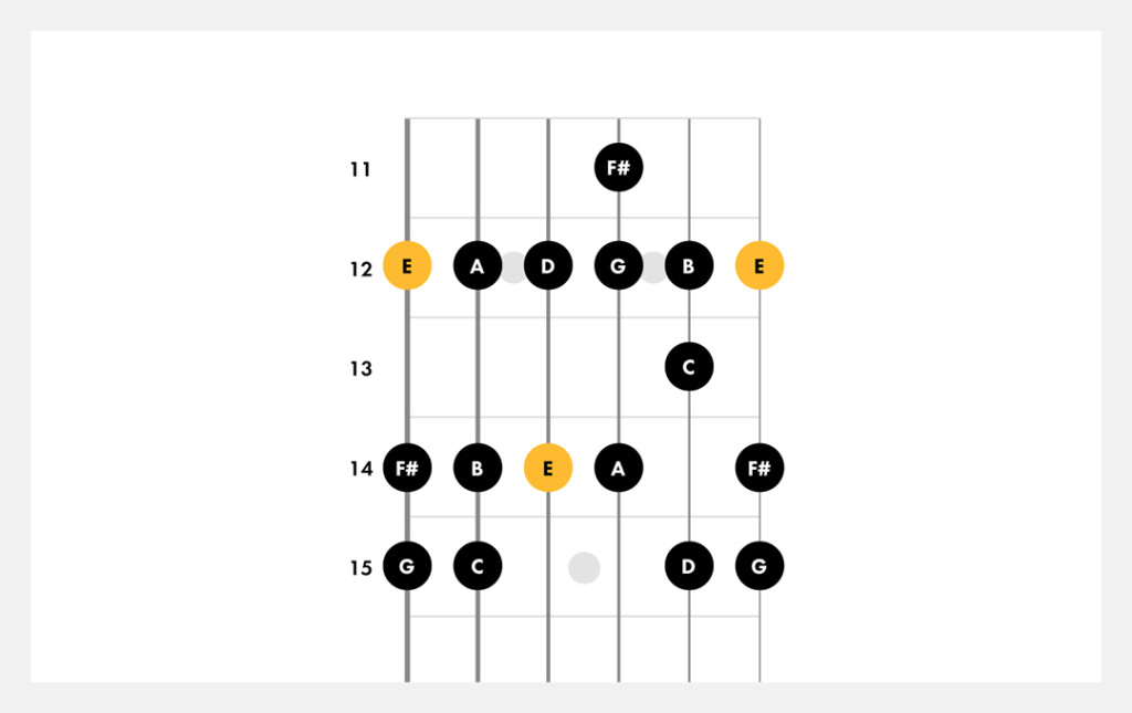 12thポジションで弾くには、12フレット、13フレット、14フレット、15フレットの音を使用します。